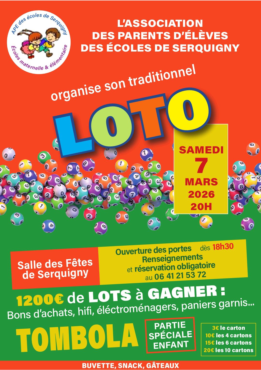 Samedi 7 mars 2026 à 20h, l'Association des Parents d'élèves des écoles de Serquigny organise un loto ...