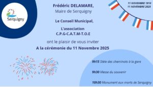 A l’occasion de la commémoration du 11 novembre, Monsieur Le Maire, le Conseil Municipal de Serquigny, l’association des anciens combattants vous invitent à la cérémonie du 11 novembre.