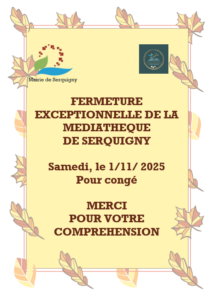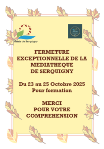 Fermeture exceptionnelle de la MédiathèqueNous vous informons de la fermeture exceptionnelle de la médiathèque, jeudi 23, vendredi 24 et samedi 25 octobre 2025 ainsi que le samedi 1er novembre 2025.