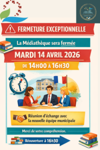 Fermeture exceptionnelle de la médiathèque de 14h à 16h le mardi 14 avril 2026