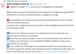 Information circulation des trains en Normandie jeudi 8 janvier et vendredi 9 janvier