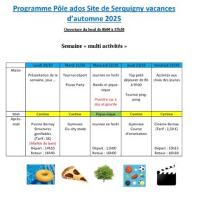 Ci dessous le programme du pôle ados de Serquigny pour les vacances d’automne