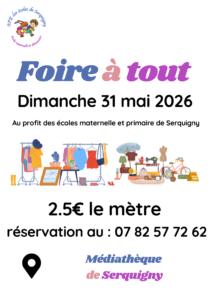 Foire à tout de l’Association des Parents d’Elèves de Serquigny près de la médiathèque le dimanche 31 mai 2026